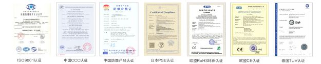 日本PSE、歐盟CE、RoSH、德國(guó)TUV等認(rèn)證。